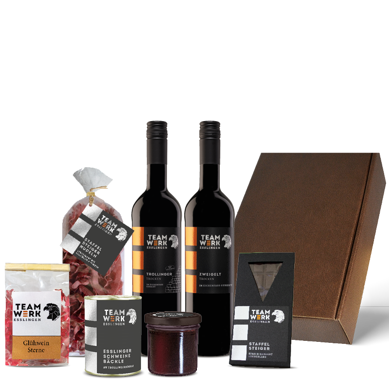 Dieses liebevoll zusammengestellte Weinpaket vereint alles, was man für genussvolle Feiertage braucht – von edlen Tropfen über herzhafte Spezialitäten bis hin zu süßen Versuchungen. Enthalten sind Zweigelt trocken Stufe 8 0,75l (A: 12,5% Vol.), Trollinger trocken Stufe 8 0,75l (A: 12,5% Vol.), Staffelsteiger Rotweinnudeln 250g, Schweinebäckle 400g, Rotweingelee 125ml, Staffelsteiger Schokolade Kirsch-Krokant 100g und Glühweinsterne 150g