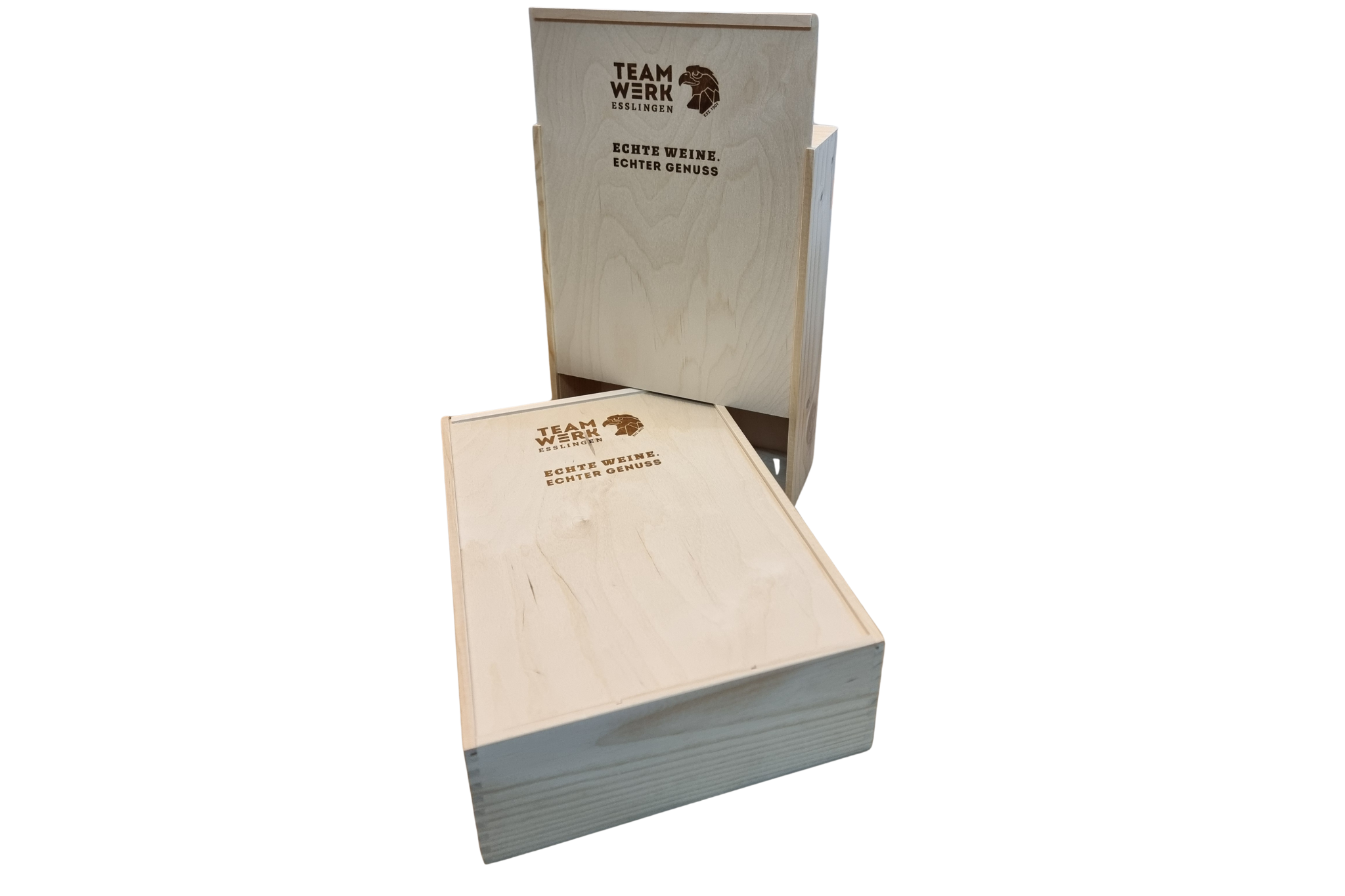 Hochwertige Geschenkholzkiste mit Logo-Branding für 3 Wein- oder Sektflaschen - natürlich, hochwertig und mit Persönlichkeit.