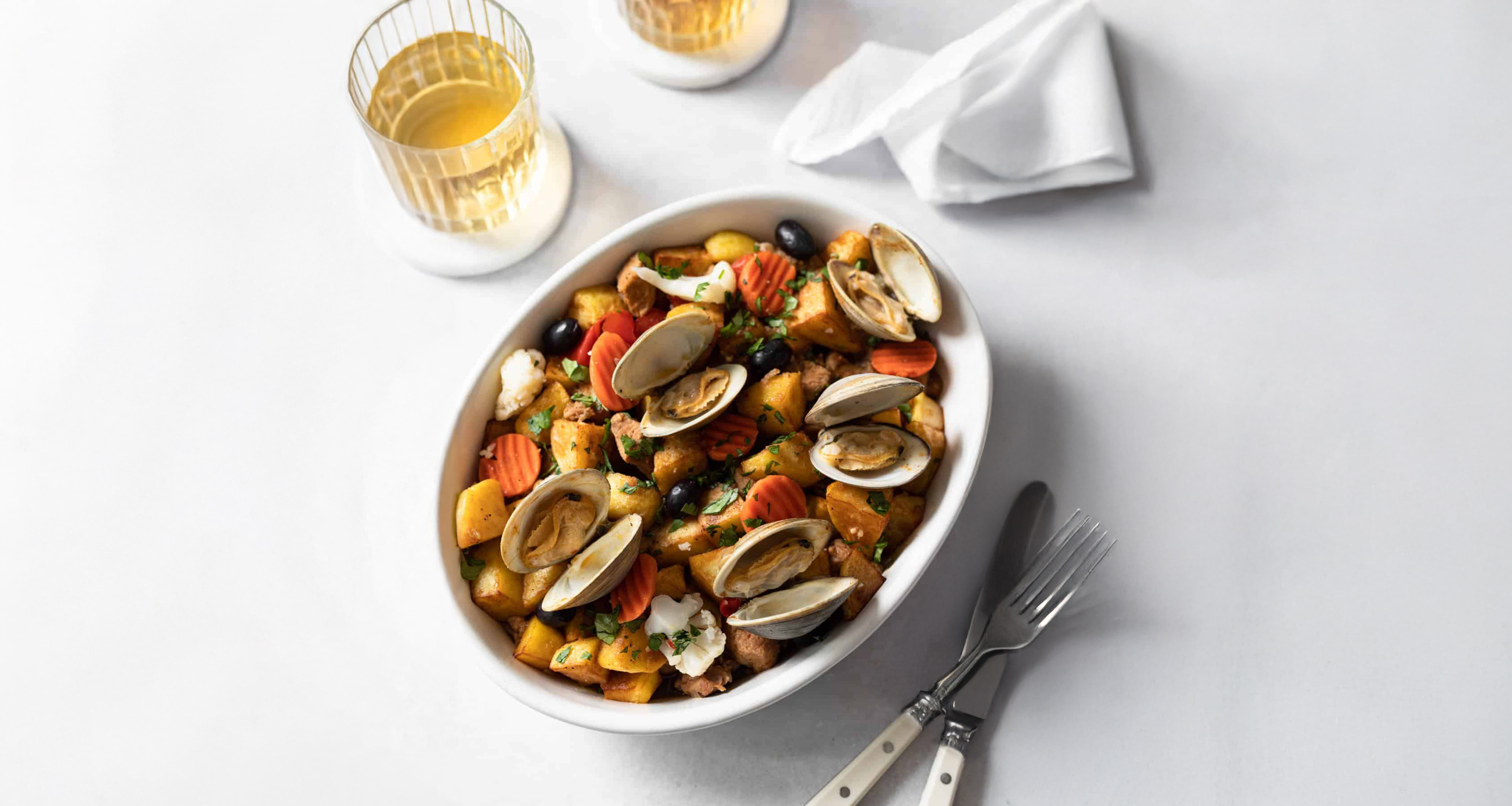 Portugisisches 3-Gang-Menü: Bolinho de bacalhau & Rissois auf Salat | Bacalhau a Lagareiro mit Zwiebeln, Paprika und Batata a murro | Pastel de Nata, Weine aus Esslingen und Portugal, Mineralwasser, Sektempfang, Espresso, Portwein, Fado – Live Musik original aus Porto.